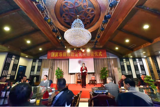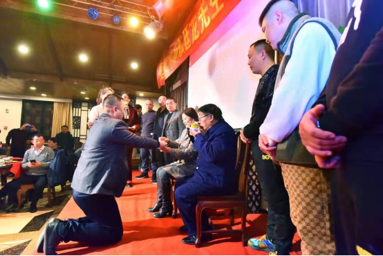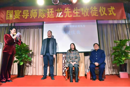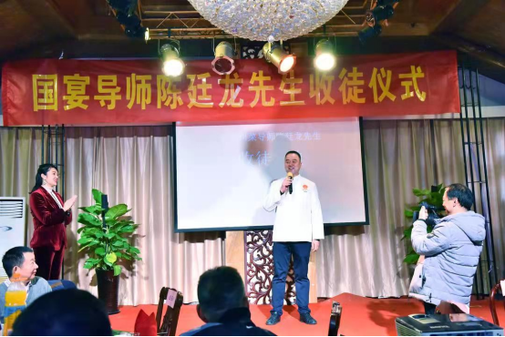 收徒仪式在一片欢乐祥和的氛围中拉开帷幕,来自全国各地的50余位餐饮界专业人士和20余陈氏门徒共同见证了岳强新先生向陈廷龙大师行拜师礼仪。仪式感让人显得庄重。在拜师过程中,弟子岳强新面对着师父师娘举行了三跪拜。随后,陈廷龙老师发放师门证和礼品,自此,岳强新进入师门,陈廷龙老师再添新徒。