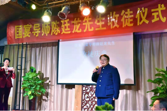 仪式上,国宴川菜导师陈廷龙致辞表示,感谢大家的光临,是大家的热情和祝福给这个寒冷的冬天带来了温暖。今天的收徒仪式意味着川菜陈门的发展壮大,也意味着陈门精神的发扬壮大。川菜陈门的传承与发展需要更多新鲜血液的融入与延伸。川菜这门技艺的传承需要时间的沉淀,更需要匠人匠心。我将一定恪尽职守,为人师表,毫无保留,励其志、树其德、坚其心、勉其行;同时也希望弟子岳强新笃信好学、德艺双馨、守正创新,成长为一名优秀的川菜人才,弘扬中华民族传统文化做出更大的贡献。