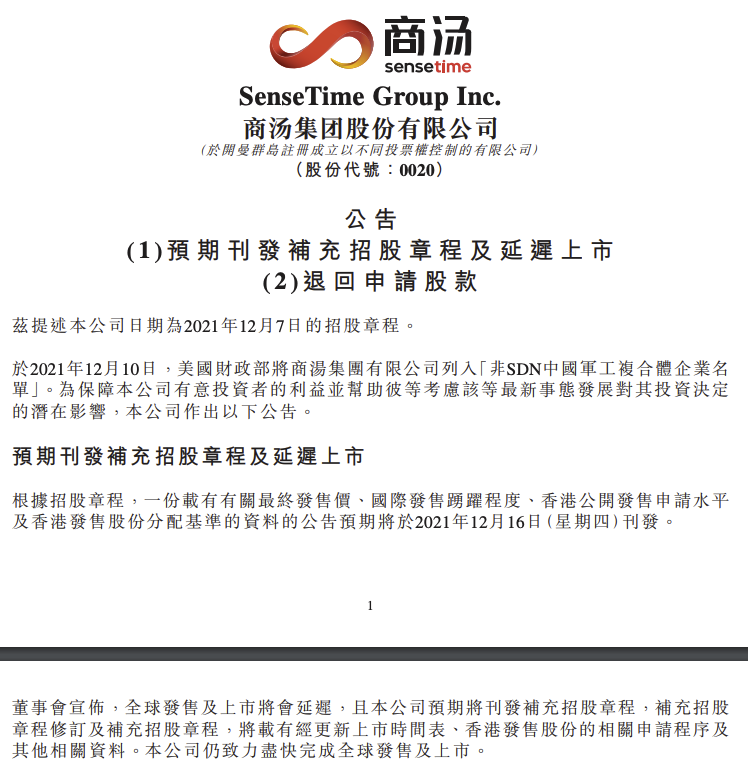 商汤12月13日午间在港交所公告,董事会宣布,全球发售及上市将会延迟,且公司预期将刊发补充招股章程,补充招股章程修订及补充招股章程,将载有经更新上市时间表、香港发售股份的相关申请程序及其他相关资料。公司仍致力尽快完成全球发售及上市。所有申请股款将不计利息悉数退还予所有申请人。