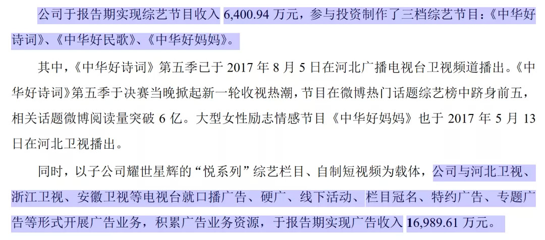 但是,一旦计提负债必将使当代东方的资产承压,这才有了公司回复函中的“无稽之谈”。要知道,在该合作尚能盈利之时,当代东方的财报中便有来自河北卫视的收入。比如在2017年,当代东方参与制作河北卫视播出的《中华好诗词》《中华好民歌》《中华好妈妈》,累计营收超6400万,同年,当代东方的广告收入近1.7亿,其中就包括来自河北卫视的广告收入。