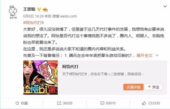 此举引得王思聪发博呛声,事情热度立刻飙升。迫于压力,阿怡在6月9日承认自己确实存在买账号和部分代打行为。