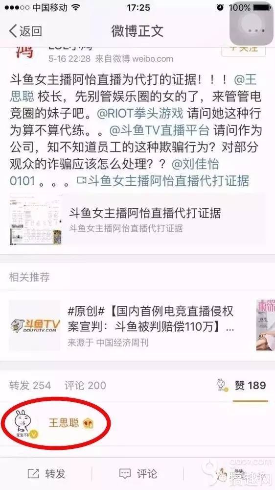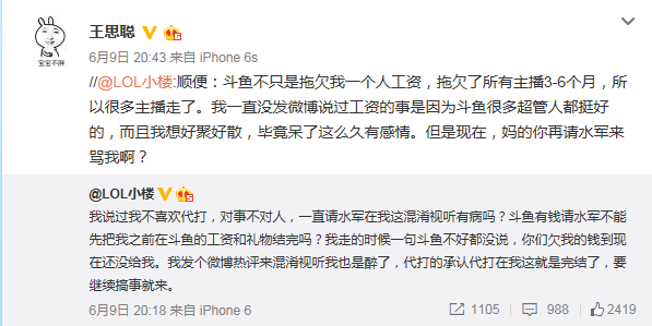 而抨击代打犹嫌不足,6月9日,王思聪又转发了LOL小楼的微博,直指斗鱼拖欠工资。