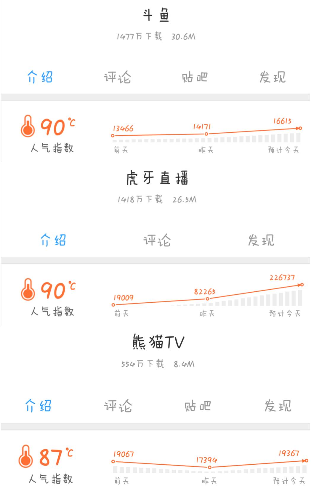 不过整体来看,熊猫TV和斗鱼、虎牙直播等平台相比,没有太多改变和突破。纵然使出了签约Angelababy、打造明星主播阵容的招数,熊猫TV在App store上530多万的下载量,和其他两家1400多万的下载量比起来,差得有点远。