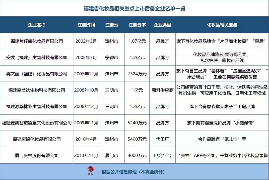 根据福建省地方金融监督管理局在今年7月和12月先后发布的两批“福建省重点上市后备企业名单”显示,目前该省已有8家化妆品相关上榜,主要分布在漳州、宁德、三明、厦门4个城市。