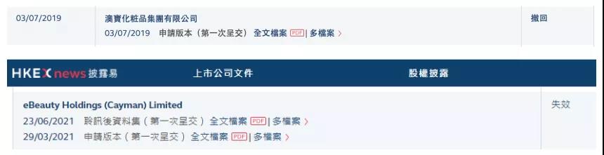 此外,2019年3月在港交所递交上市申请书的澳宝化妆品集团有限公司和今年6月在港交所递交上市招股书的悠可集团,目前其状态分别显示为“撤回”和“失效”。据了解,在递交文件超过6个月后,如果没有通过审讯或是被驳回,该资料会显示为“失效”。