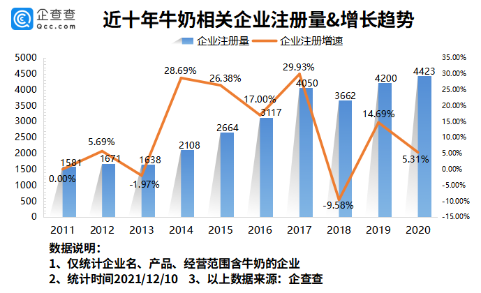 企查查数据显示,我国现存牛奶相关企业4.30万家。2018年我国新增牛奶相关企业3662家,同比减少9.58%。2019年新增4200家,同比增长14.69%。2020年新增4423家,同比增长5.31%,是近十年新增牛奶相关企业最多的一年。