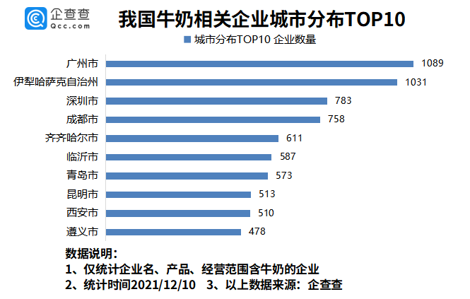企查查数据显示,从城市分布来看,广州位居榜首,有1089家牛奶相关企业。伊犁哈萨克自治州、深圳分别有牛奶相关企业1031家、783家。此后依次为成都市、齐齐哈尔市、临沂市等。