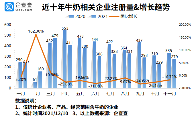 企查查数据显示,2021年前11月,我国新增牛奶相关企业3433家,同比减少15.88%。最近的11月,我国新增牛奶相关企业279家,同比减少16.72%。10月我国新增牛奶相关企业229家,同比减少26.13%。