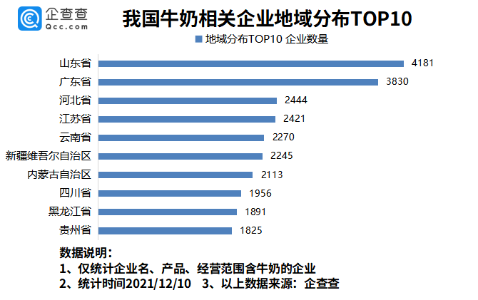 企查查数据显示,从区域分布来看,山东以4181家牛奶相关企业排名第一,广东、河北分别有3830家、2444家牛奶相关企业,排在第二、三名。此后依次为江苏省、云南省、新疆维吾尔自治区等。