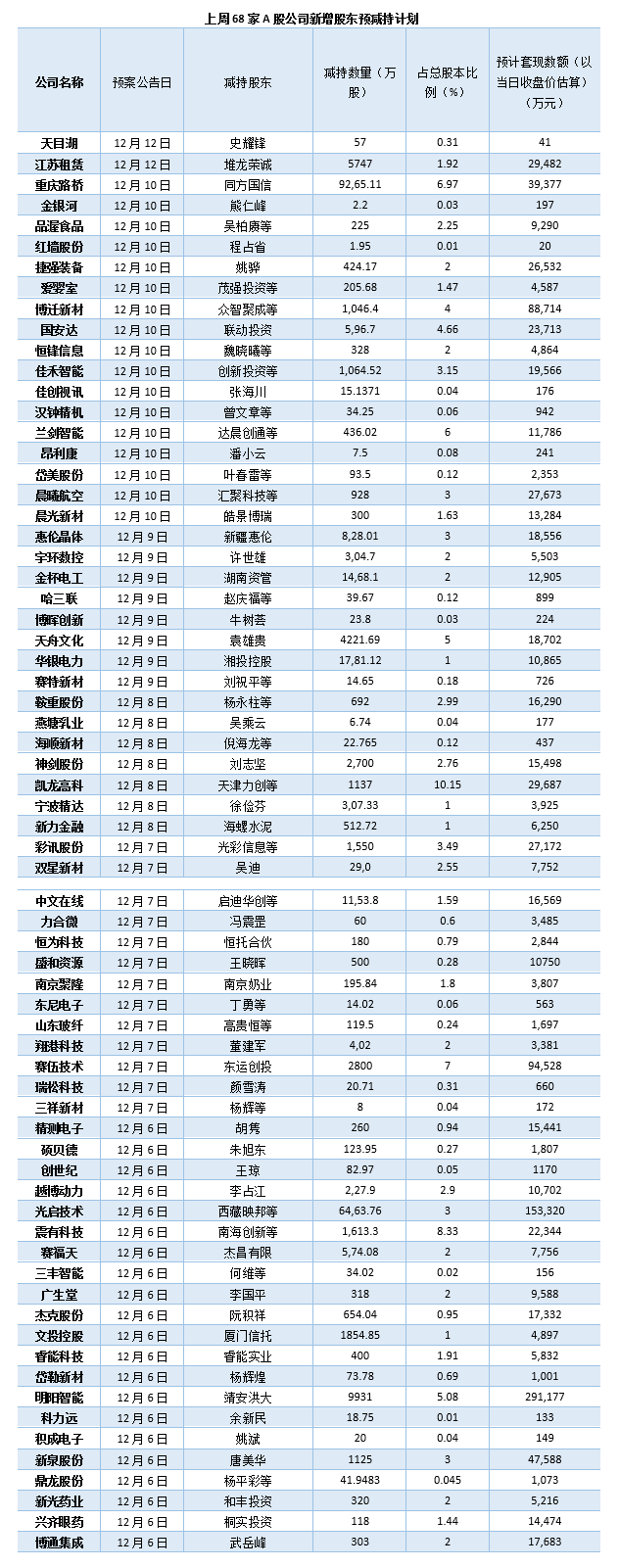 上周(12月6日至12月12日),A股市场减持规模较此前有所减少。据界面新闻不完全统计,共有81家A股公司披露股东减持计划。