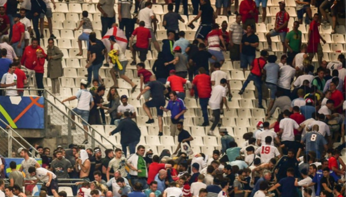 英俄大战开始前,双方球迷就已经在球场外上演全武行,双方互有胜负,英格兰球迷甚至稍稍落于下风。据BBC等外媒报道称,有两名英格兰球迷受到了严重的伤害,一度生命垂危。