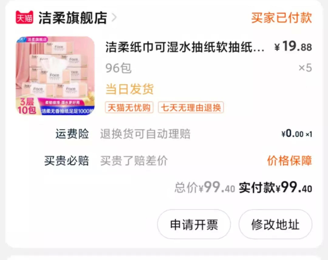 当晚,纸巾品牌洁柔旗舰店参与淘宝百亿补贴的一款商品出现价格bug,商品链接中从10包到96包不等的规格,均可以19.9元的价格下单。很快,多个羊毛群及购物小组同步分享了这一“羊毛”,商品销量迅速涨至20万。几天后,商家给出的解决措施是,所有“羊毛”订单进行退款不发货,并补偿每位下单用户10包同款规格纸巾。