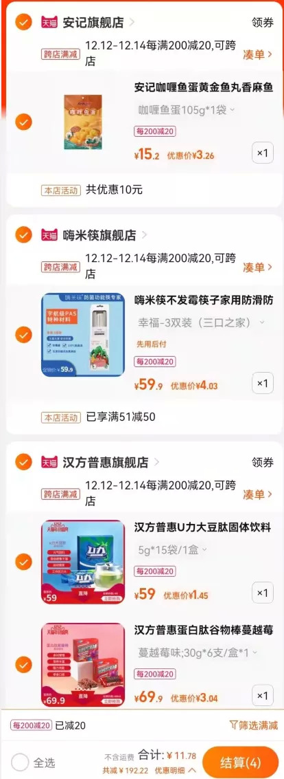 羊毛群内分享的凑单优惠,可以近12元购买原价超200元的商品