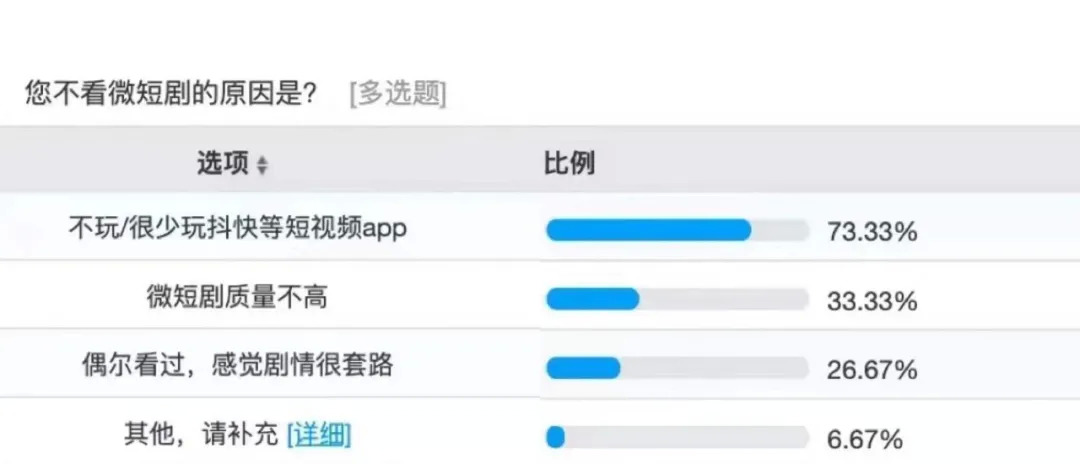 数娱君近期针对短剧认知开展了抽样调查,受访者普遍来自一二线城市、工作年限在5年以内,可以说是有钱有闲有追剧偏好的年轻人。但调查结果显示,其中近五成受访者不看短剧,排在前列的理由是:不刷短视频、短剧质量不高、剧情套路、没有现实意义等等。