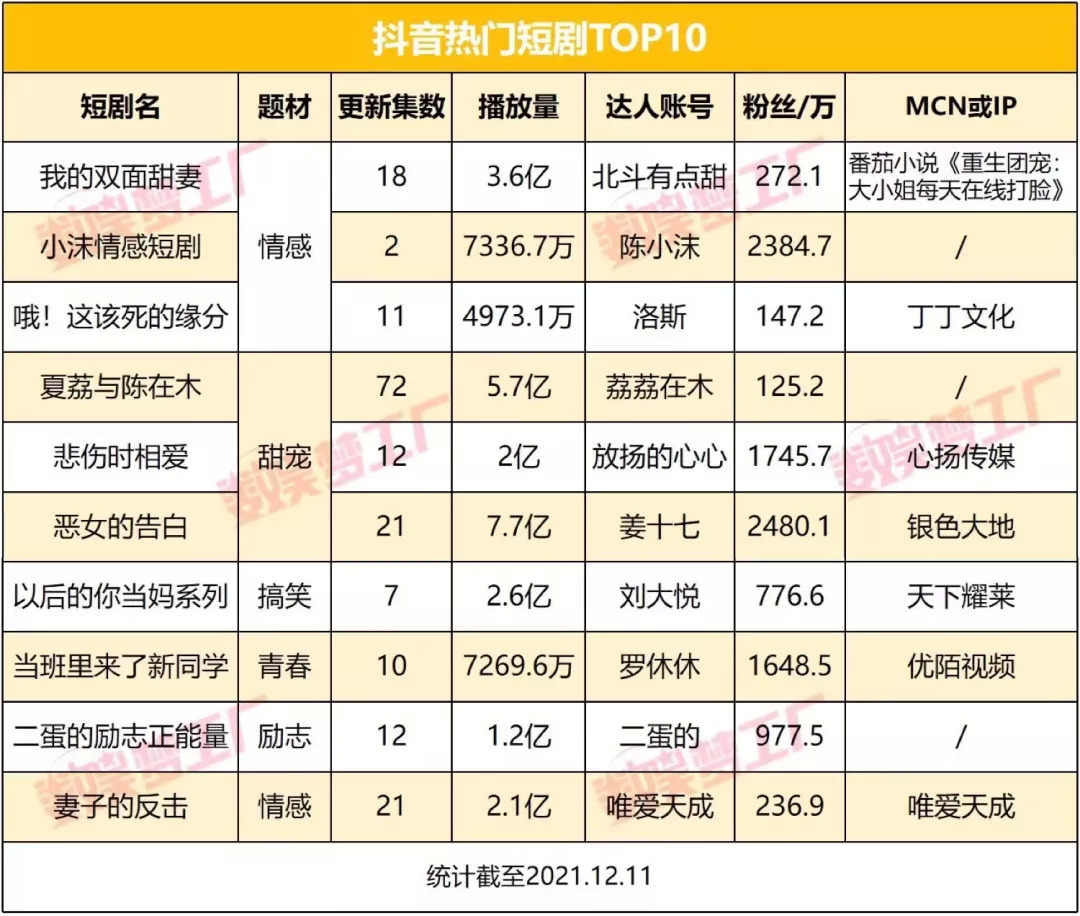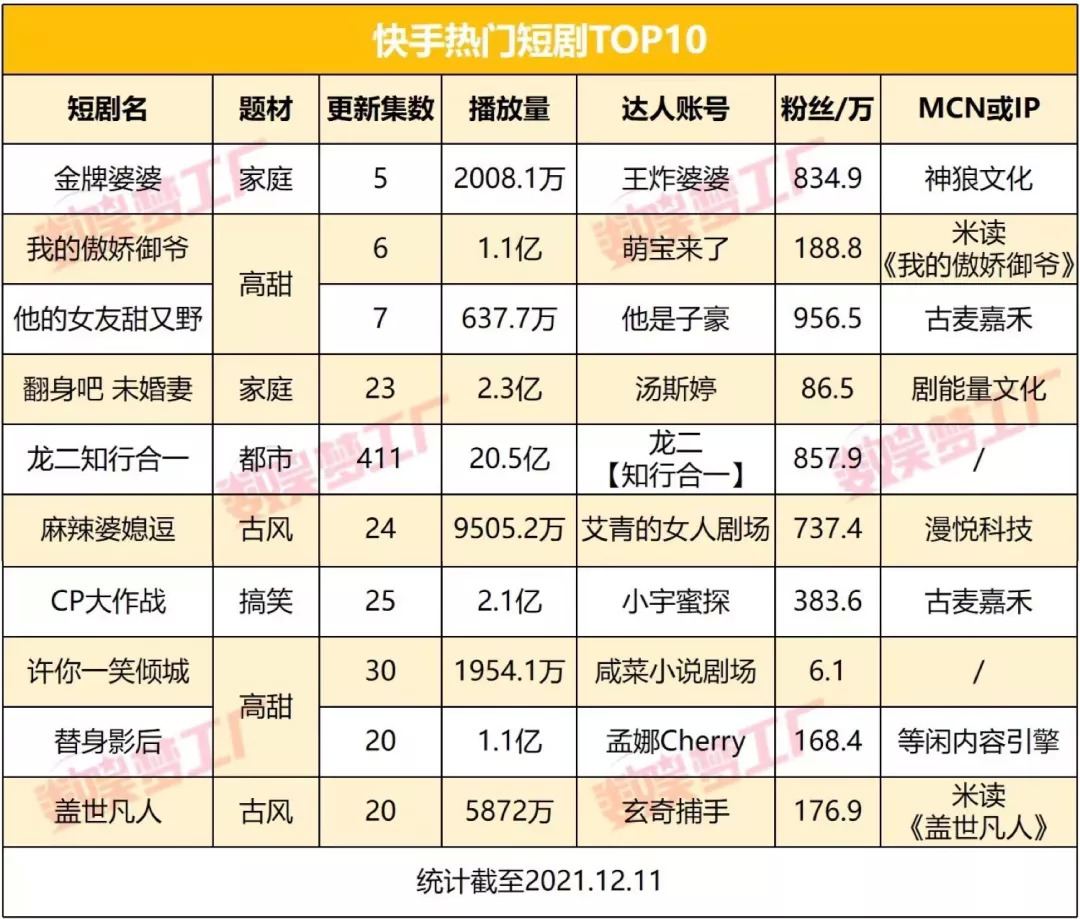 12月11日,快手、抖音热门短剧榜单显示,广州神狼文化、青岛古麦嘉禾、上海银色大地、杭州心扬传媒等各地头部MCN仍然牢踞短剧榜单TOP10,根据米读、番茄小说等平台改编的情感、高甜、古风爽剧同样占领高位。