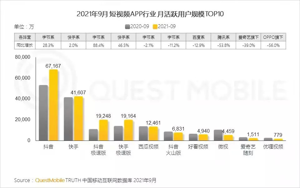 短剧内容迅速壮大,背后是短视频平台的内容焦虑。QuestMobile《2021互联网秋季报告》显示,同比去年,除抖快这些头部应用的月活跃用户规模有所增长外,其他阵营用户流失明显,而处于绝对头部的抖音月活也仅增长28.3%,增速不复巅峰时期。