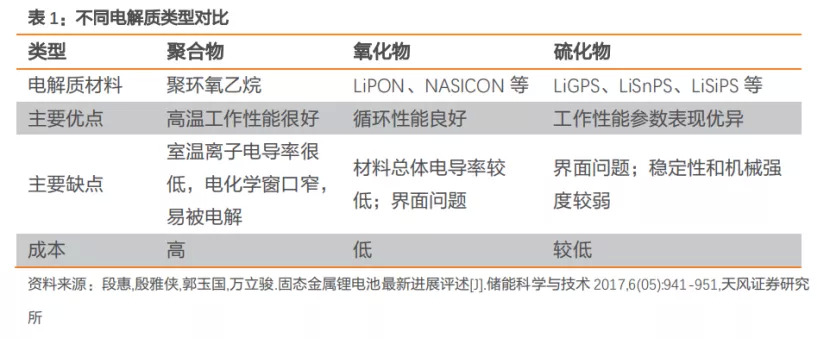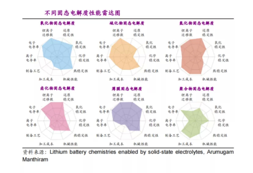 目前这一阶段,固态电池仍会采用液态锂电池的正负极,替换的是电解液和隔膜。那么,决定技术路径的差异的便是对电解质选择带来的差异。