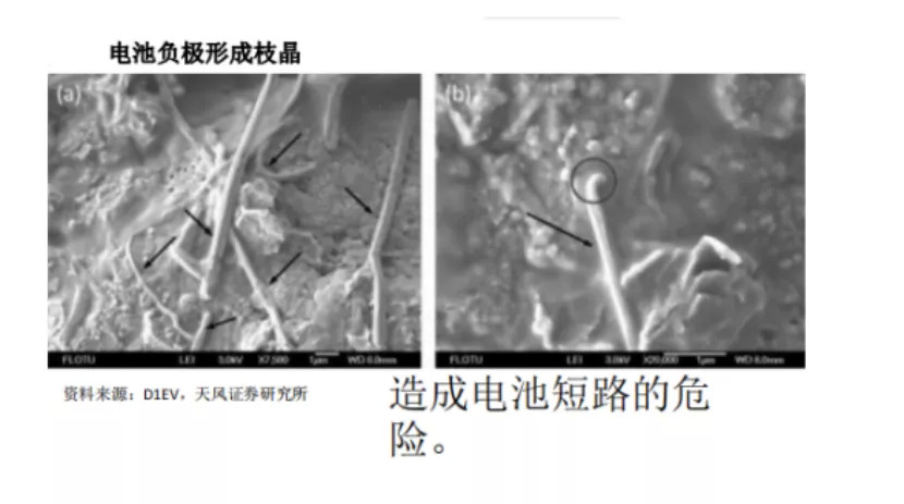 然而负极家的床位不够了,无家可归的锂离子只能睡在外面,这边是析锂,逐步形成枝晶锂,便可能刺穿电解液,造成短路,从而引发事故。