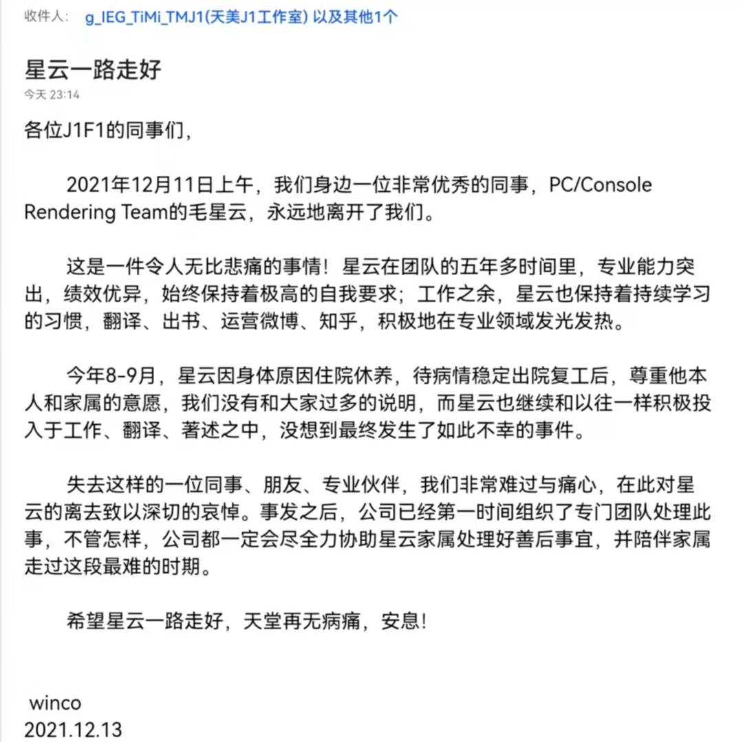 腾讯发给员工的内部邮件中显示,今年8-9月,毛星云已经因身体原因住院休养,病情稳定后曾出院复工,继续投入工作之中,但“没想到最终发生了如此不幸的事件”。