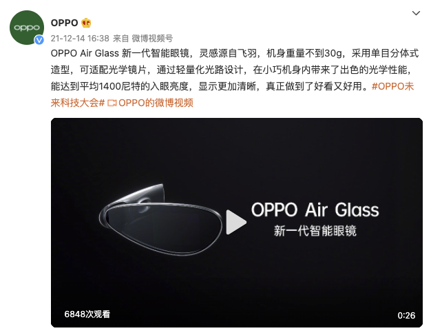 @OPPO 微博消息,12月14日,OPPO正式发布新一代智能眼镜——OPPO Air Glass。据介绍,机身重量不到30g,采用单目分体式造型,可适配光学镜片,通过轻量化光路设计,能达到平均1400尼特的入眼亮度。