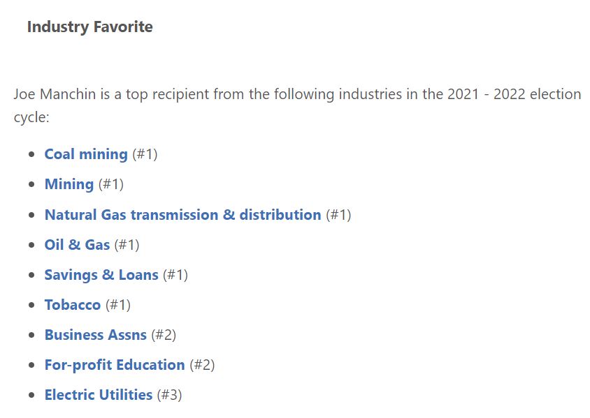 除此之外,西弗吉尼亚州是传统煤炭大州。从政前,曼钦曾创立了煤炭经纪公司,公司目前由其子管理,但公司依然是曼钦投资收益的主要来源。美国政治捐献数据库统计显示,在最近的选举周期内,曼钦是收到来自煤炭业、矿业、油气行业捐助最多的参议员。