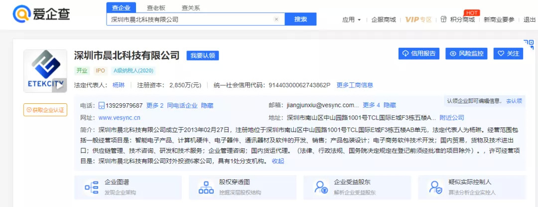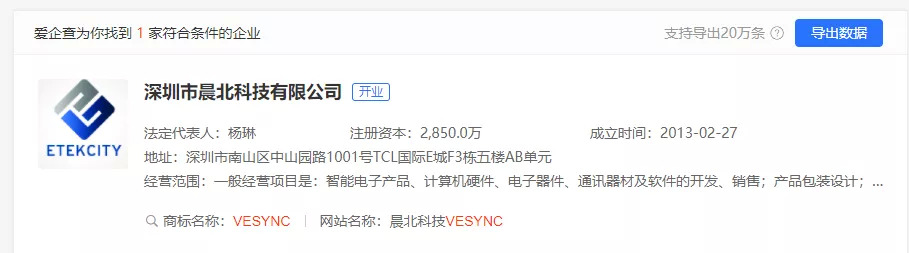 爱企查显示,VeSync所属公司为深圳市晨北科技有限公司,成立于2013年,其创始人杨琳,也实实在在是一名中国人。