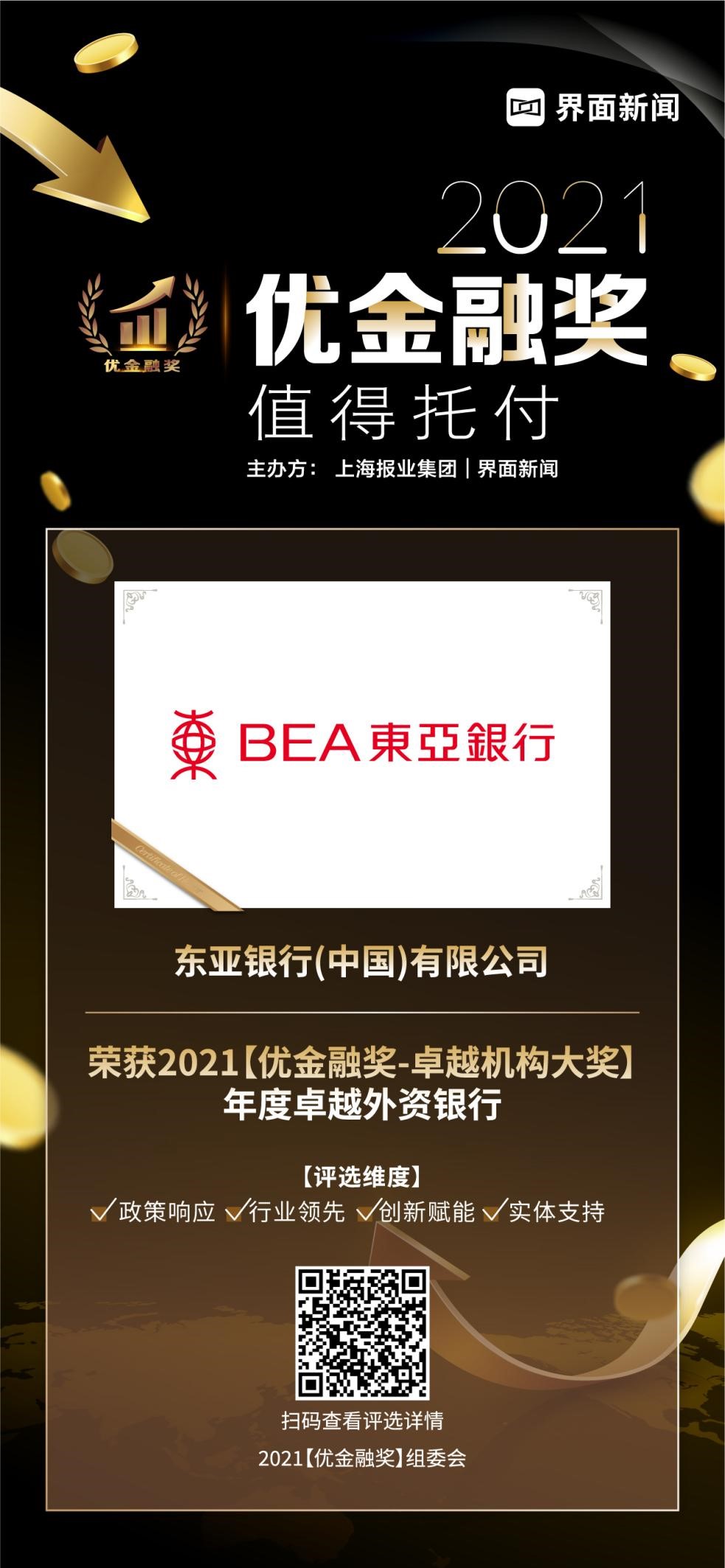 12月15日,上海报业集团|界面新闻在上海前滩香格里拉举办了2021【优金融奖】颁奖典礼,并正式公布了本年度获奖名单。在这项万众期待的金融业年度评选中,来自银行、保险、证券基金、信托、资管、金融科技、财富管理等领域的38家金融机构与企业,凭借年度市场表现与行业影响力,获得年度大奖。其中,东亚银行(中国)有限公司凭借其在行业内的优异表现,荣膺卓越机构大奖——年度卓越外资银行。