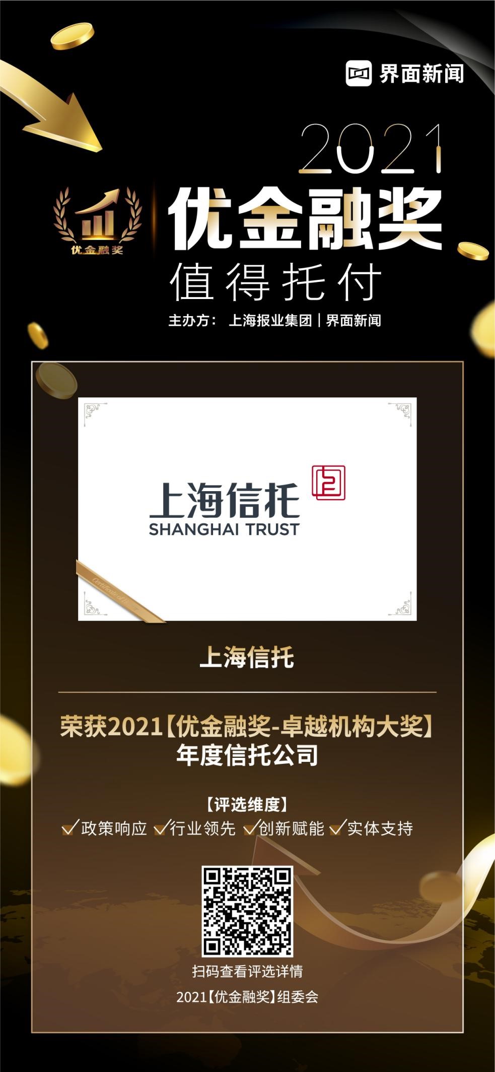 12月15日,上海报业集团|界面新闻在上海前滩香格里拉举办了2021【优金融奖】颁奖典礼,并正式公布了本年度获奖名单。在这项万众期待的金融业年度评选中,来自银行、保险、证券基金、信托、资管、金融科技、财富管理等领域的38家金融机构与企业,凭借年度市场表现与行业影响力,获得年度大奖。其中,上海信托凭借其在行业内的优异表现,荣膺卓越机构大奖——年度信托公司。
