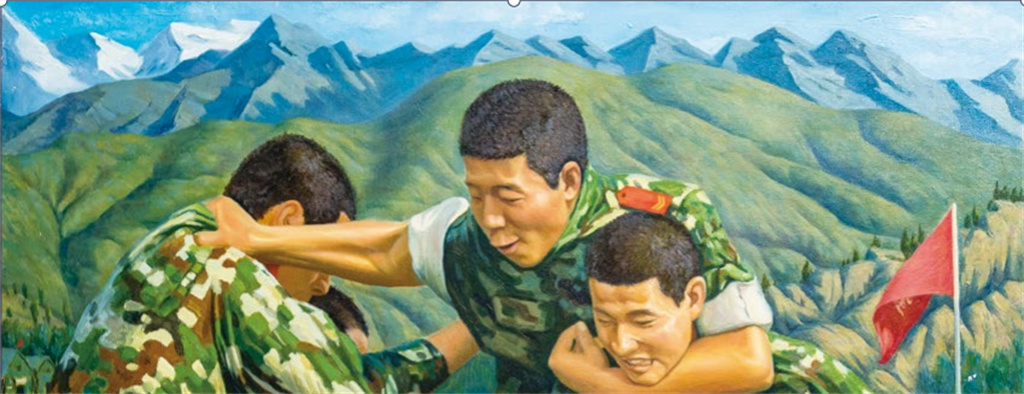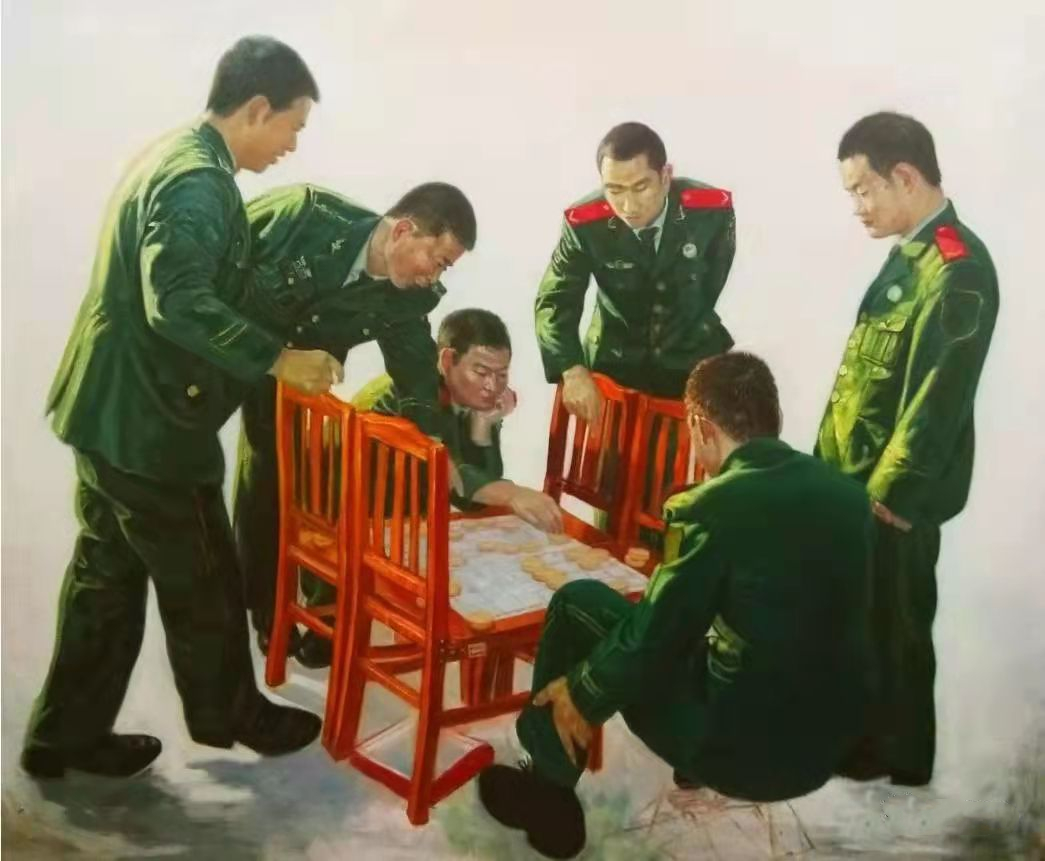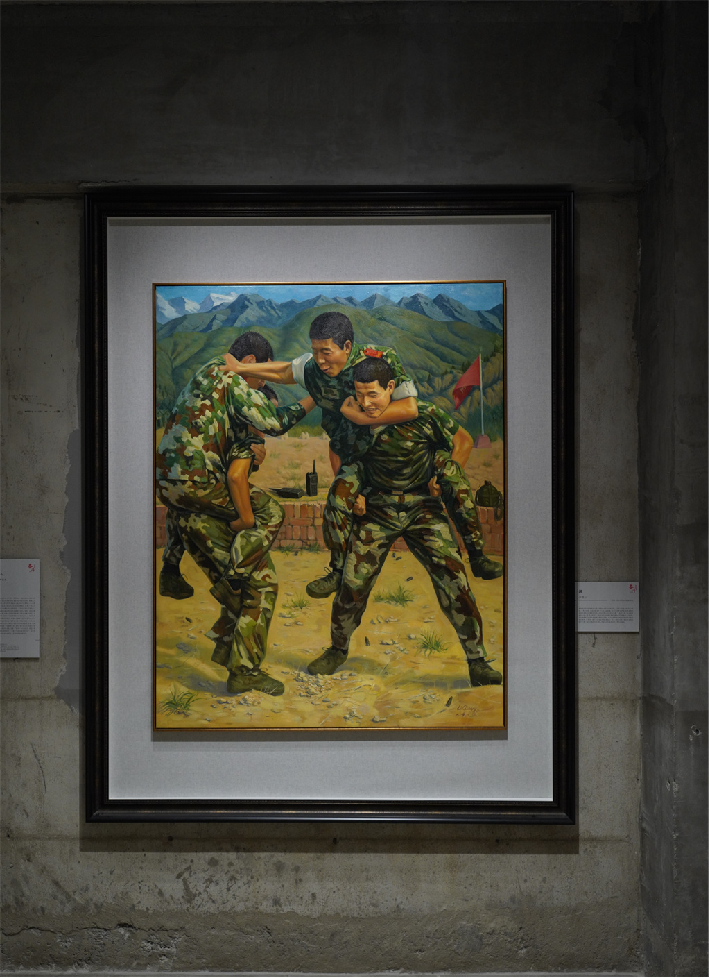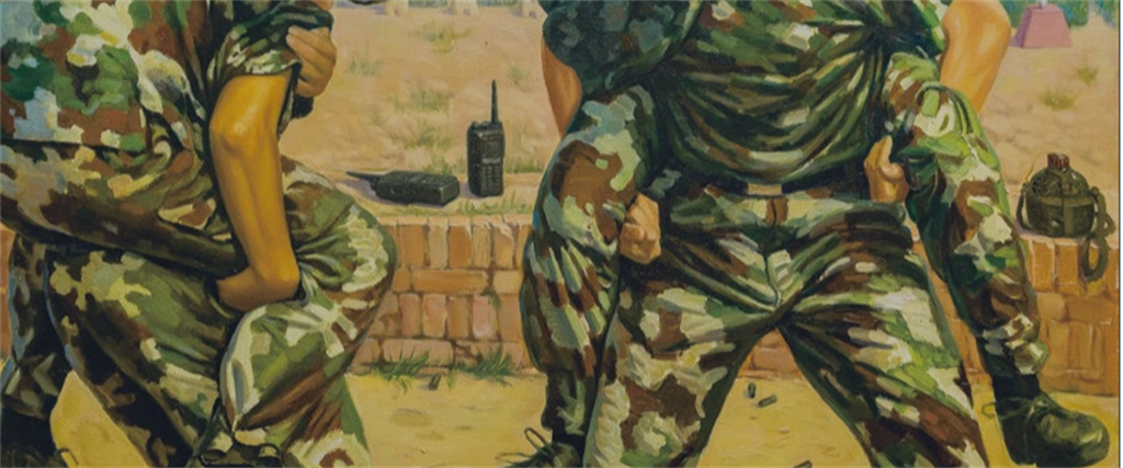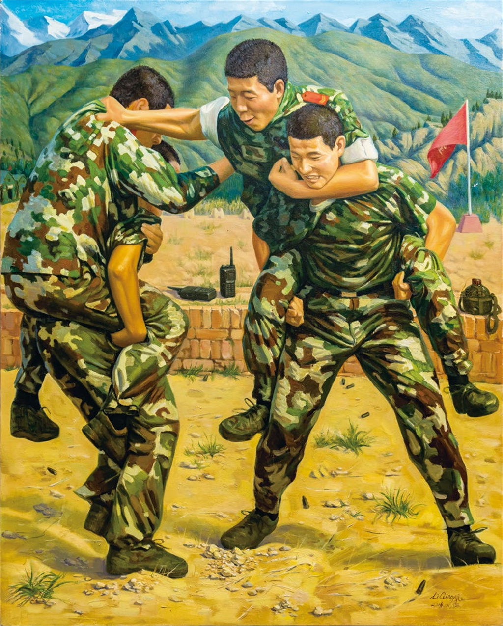 相比英雄传奇、战争风云等军旅题材,军营生活的最大优势是与青年官兵现实生活的距离较近,更接地气,更具时代性和感召力。80后画家李青一在大学时应征入伍,《搏》描绘的正是画家和战友们在训练之余玩“骑马打仗”的一个瞬间。当时画家服役的部队在西藏昌都执行任务,战士们在射击靶场训练的间隙玩起的竞技游戏,给李青一留下了深刻的印象。退伍后,李青一回归大学,创作了第一幅部队题材作品《搏》,用来纪念军旅生涯令人难忘的瞬间。