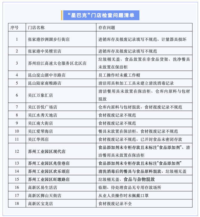 其中,208家门店监督检查结果为:符合(食品安全要求),其余18家门店存在进销库存及报废记录不规范、加工区域垃圾桶未加盖、已开封食材未密闭存放、个别员工操作时未佩戴口罩、仓库中食品和非食品混放等问题。对检查中发现的问题,已依法处置并责令相关单位限期整改。