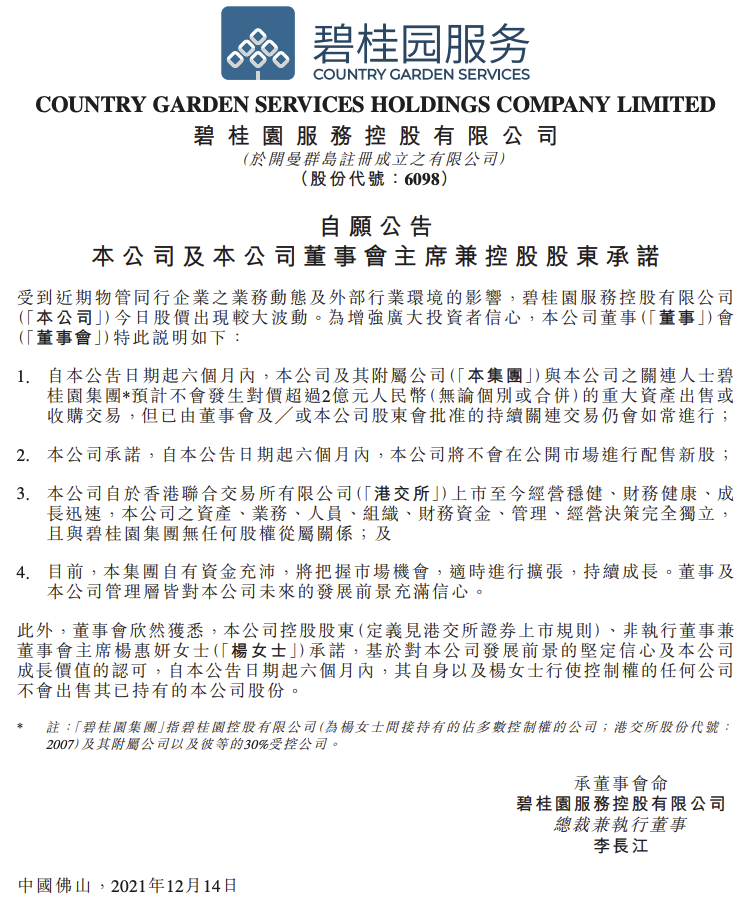 碧桂园服务12月14日晚间在港交所公告,受到近期物管同行企业之业务动态及外部行业环境的影响,公司今日股价出现较大波动。为增强广大投资者信心,公司董事会特此说明如下: