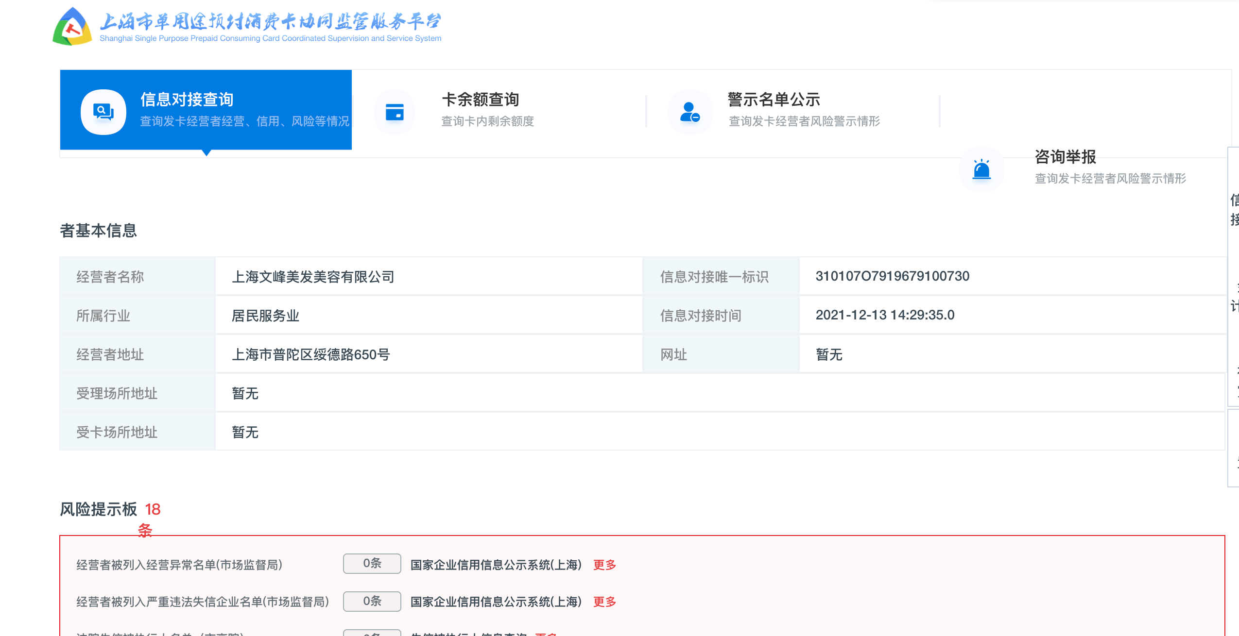其所属行业为居民服务业,目前该网站显示上海文峰“已对接信息,无风险警示”。但记者在该平台尚未看到文峰公司在该网站公示专款账户的相关信息和“保证金”比例。在上海市单用途预付卡协会的网站上,记者也无法查询到文峰公司预付卡发行量、金额以及售卡地址、用卡地址。