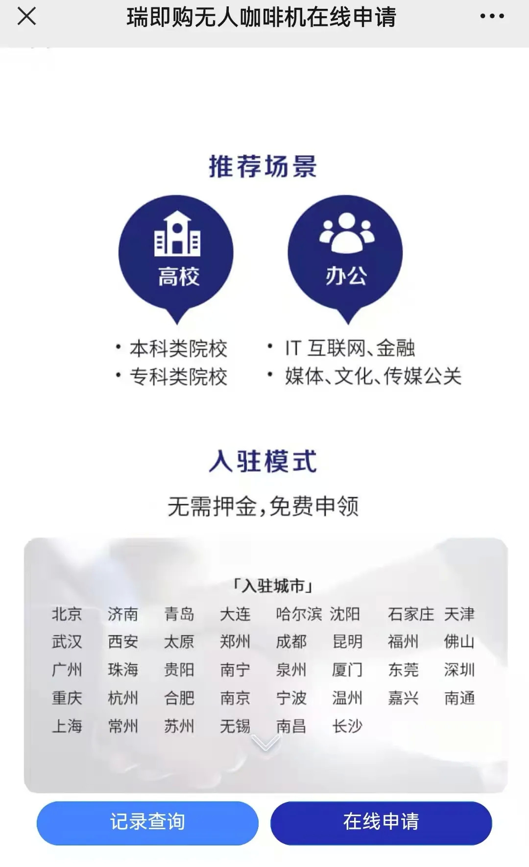 除了加速扩张加盟店之外,瑞幸咖啡也在大力推瑞即购无人咖啡机,瑞幸咖啡公众号瑞即购招商页面显示,目前已有38城开展瑞即购,入驻的城市包含北京、济南、青岛、大连、上海、广州、杭州、重庆等地。据媒体报道,瑞幸在上海新开的74家店中,有59家是瑞即购。