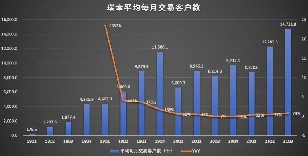 “爆款”产品也带动了瑞幸交易用户的持续增加。财报显示,平均月度交易用户也得以持续快速增长,三季度达1470万人,较2020年同期的820万人增长79.2%。