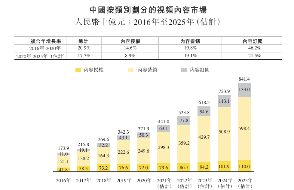 根据弗若斯特沙利文的资料,2016年至2020年,中国视频内容市场规模由人民币1739亿元增至人民币3719亿元,复合增长率为20.9%。受需求增长的推动,预期视频内容的总市场规模于2025年将达到人民币8414亿元,2020年至2025年复合增长率为17.7%,市场增长迅速。