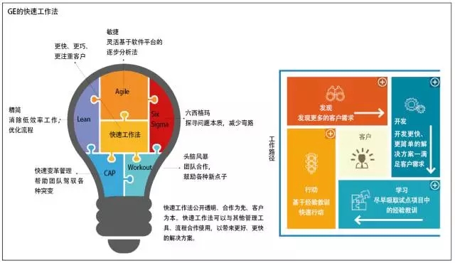 一场精减变革便在这样的背景下诞生,伴随着这一变革的是GE业务回归工业制造,2005年时金融占公司收入的28%,但近年来GE不断地砍掉这些曾经获益颇丰的业务,并为数字领域的发展做战略铺垫。2014年,针对这一数字化转型,GE也推出全新的价值观“GE信念(GE Beliefs)”,强调客户导向、速度、精益和学习,并将“快速工作法”体现在整个组织的管理运营中。