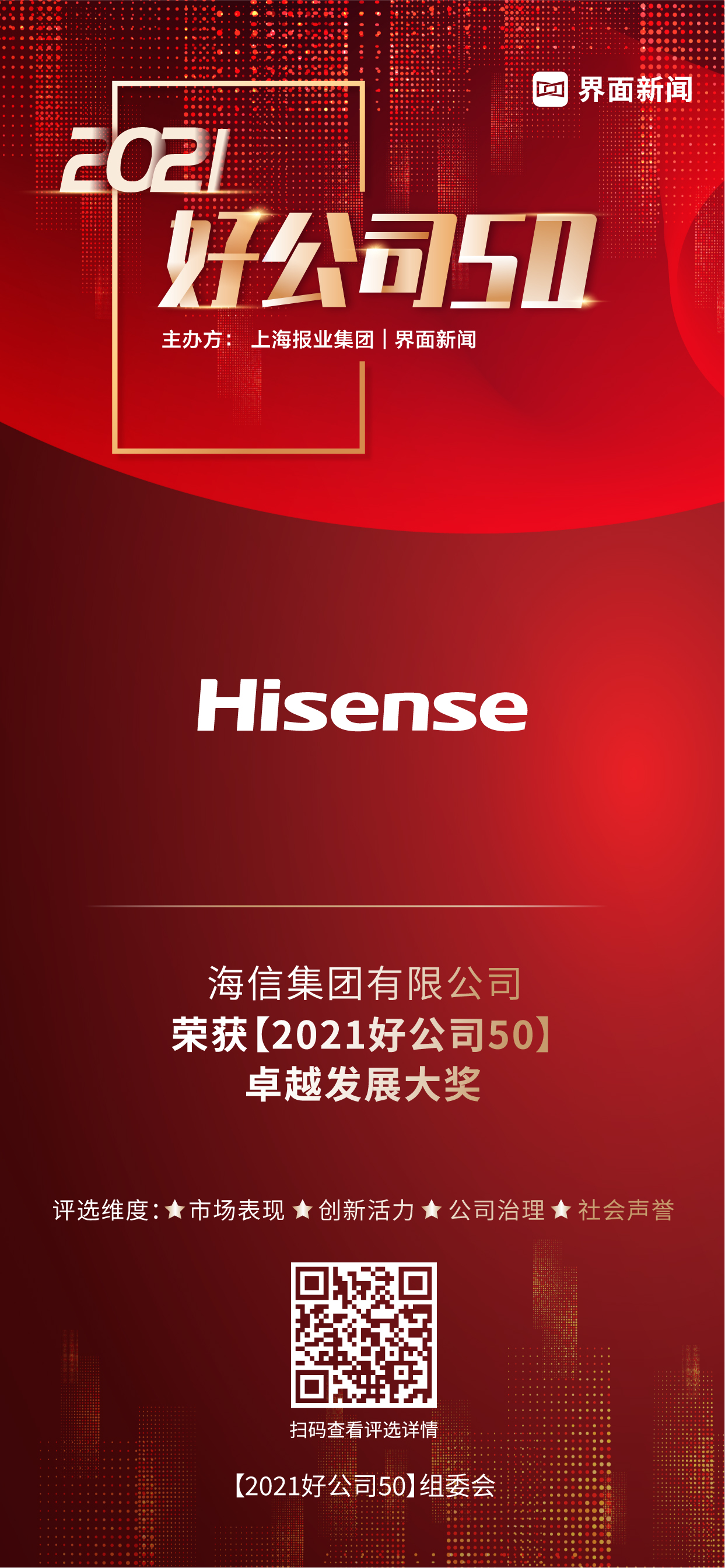 12月15日,上海报业集团|界面新闻在上海前滩香格里拉举办了【2021好公司50】颁奖典礼,正式公布了本年度的获奖名单。来自38个细分行业的500余家候选公司,经过大众投票、市场表现、创新活力、公司治理、社会声誉等方面的角逐,最终50家优质企业突破重围荣登年度荣誉榜单。海信集团有限公司凭借着以用户的体验为出发点的初心,不断追求技术创新,荣膺【2021好公司50——卓越发展大奖】。