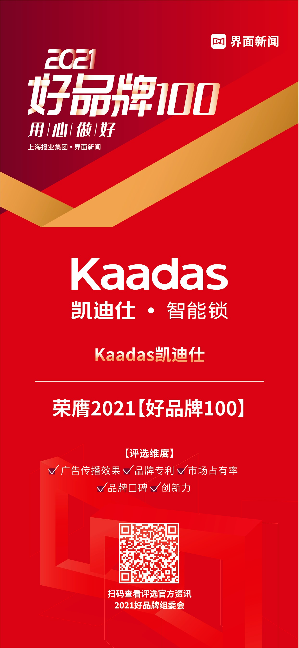 Kaadas凯迪仕专注于智能锁领域,是一家集产品研发、制造、销售、安装、售后于一体的全产业链公司,是国家高新技术企业,总部位于中国深圳,以服务全球每一个家庭作为愿景,坚持以科技的点滴进步,让人们的生活更美好,以安全、便捷、智能的产品,为万千家庭带来高品质生活体验,让科技的光芒温暖每一个人的内心。此次,凯迪仕作为智能门锁行业唯一的获奖品牌,荣登2021【好品牌100】主榜。