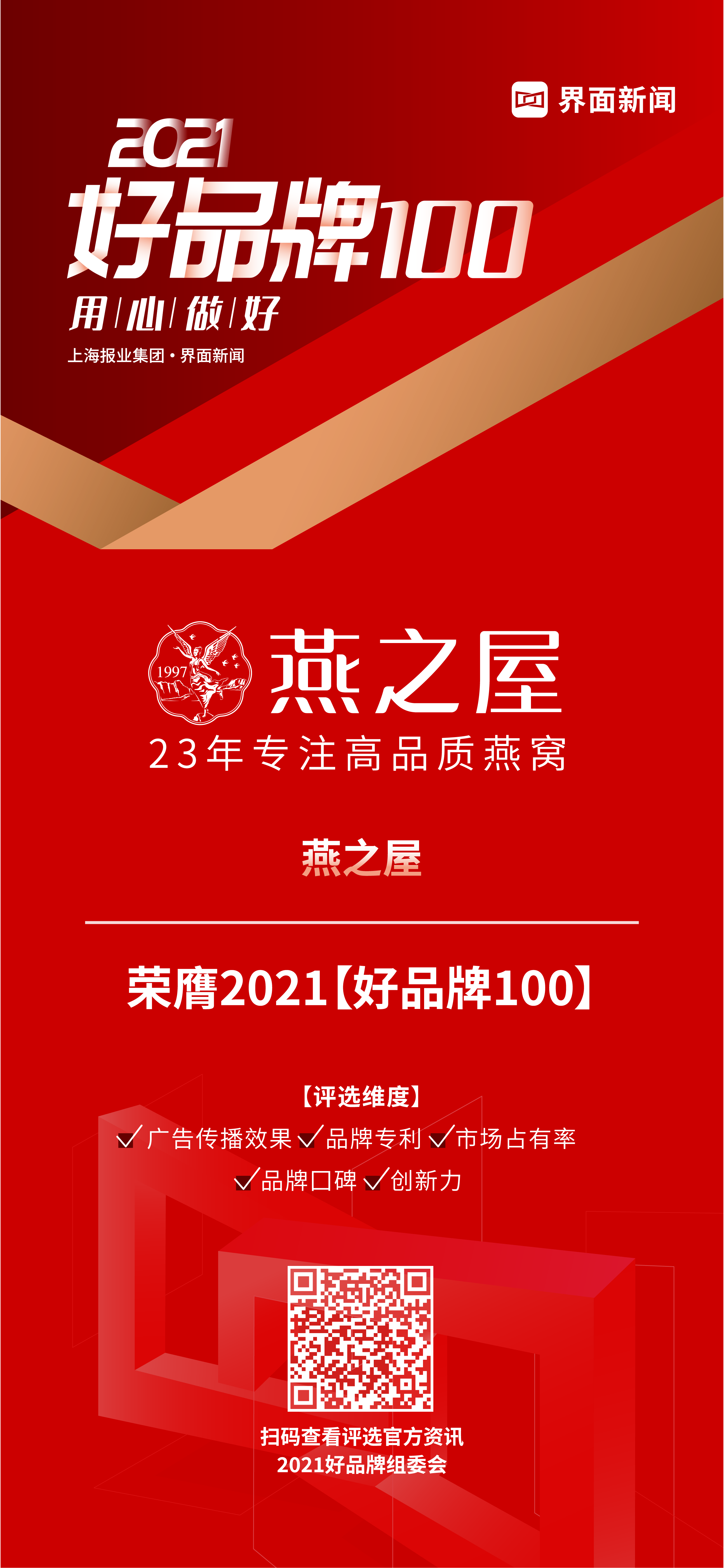 上海报业集团 | 界面新闻举办2021【好品牌100】评选活动,聚集100位专家,100个行业赛道,最终评出100个品牌,持续寻找讲好品牌故事、拥有核心竞争力、持续创新、面向国际的 “好”品牌。