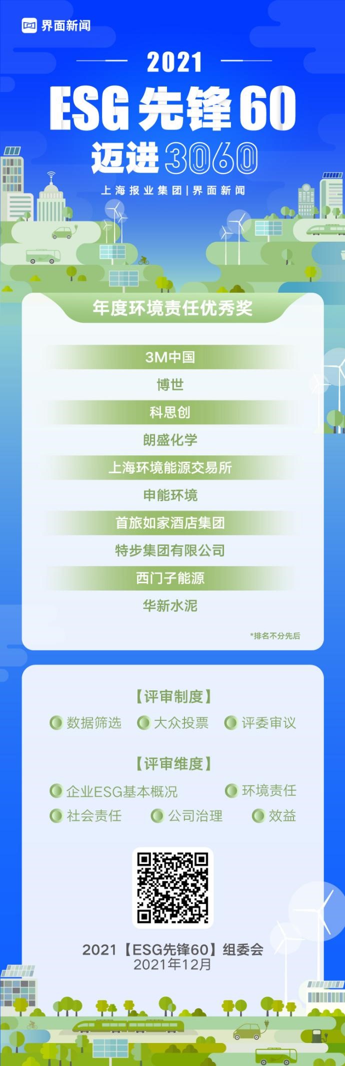 2021【ESG先锋60】评选,主办方旨在通过主流财经媒体平台的影响力,寻找经济效能与社会责任并重的绿色企业与业内先锋人物。在综合考量企业ESG的基本概况、环境责任、社会责任、公司治理责任以及效益五大维度的基础上,展现企业在“碳中和”时代下的核心竞争力。本次评选中不限参与企业的所有制类型、国别、规模以及所处行业,通过两个多月的数据筛选、大众投票、评委审议等多个环节的考察,全面衡量了参选企业的ESG实践能力,力求对企业的年度价值和ESG表现作出客观、公正的评价。在经历层层筛选之后,50家ESG绿色企业与10位业内先锋人物位列终榜,共同夺得这项殊荣!