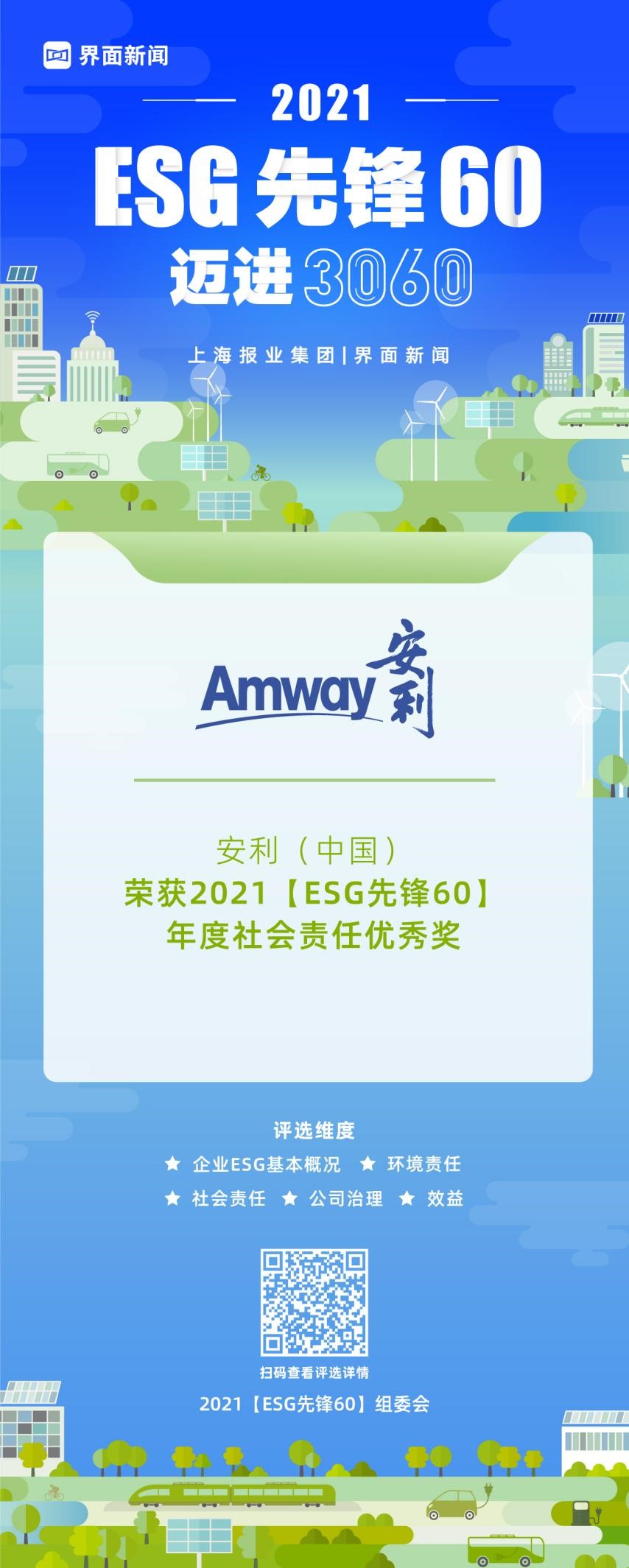 12月15日,上海报业集团|界面新闻在上海前滩香格里拉举办了2021【ESG先锋60】颁奖典礼,并正式公布了本年度获奖名单。在这项万众期待的关于ESG议题的年度评选中,来自各行各业的50家绿色先锋企业与10位先锋探索人物,凭借年度市场表现与行业影响力,获得年度大奖。其中,安利(中国)凭借其在行业内的优异表现,荣膺年度社会责任优秀奖。