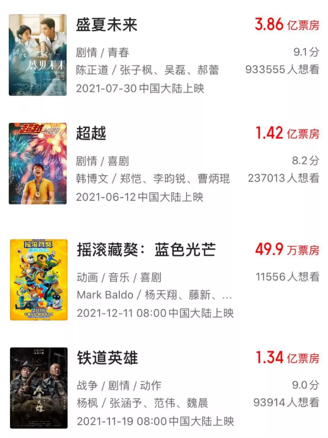 五大中的吊车尾是华谊。去年靠《八佰》风光救市,今年拿得出手的成绩只有《盛夏未来》。但按照其宣发体量,加上抖音的深度植入,票房却仅收3.89亿,充其量只能回本。华谊主出品的其他片全军覆没,比如张涵予、范伟主演的《铁道英雄》仅收1.34亿票房,郑恺主演《超越》1.42亿,动画片《摇滚藏獒:蓝色光芒》只有41万票房。
