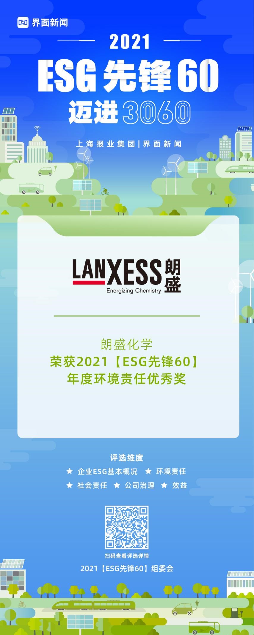 12月15日,上海报业集团|界面新闻在上海前滩香格里拉举办了2021【ESG先锋60】颁奖典礼,并正式公布了本年度获奖名单。在这项万众期待的关于ESG议题的年度评选中,来自各行各业的50家绿色先锋企业与10位先锋探索人物,凭借年度市场表现与行业影响力,获得年度大奖。其中,朗盛化学凭借其在行业内的优异表现,荣膺年度环境责任优秀奖。