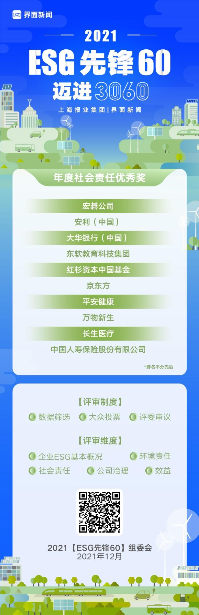 2021【ESG先锋60】评选——年度社会责任优秀奖旨在通过主流财经媒体平台的影响力表彰在劳工管理、产品责任与安全和供应链管理、人权及团队建设、劳动标准、公益捐赠等层面具有优秀表现,具备成为行业范例的企业,展现企业在社会责任上的承担力。通过两个多月的数据筛选、大众投票、评委审议等多个环节的考察,全面衡量了参选企业的ESG实践能力,筛选出本年度在社会责任层面表现突出的10家企业,他们将共同夺得这项殊荣!