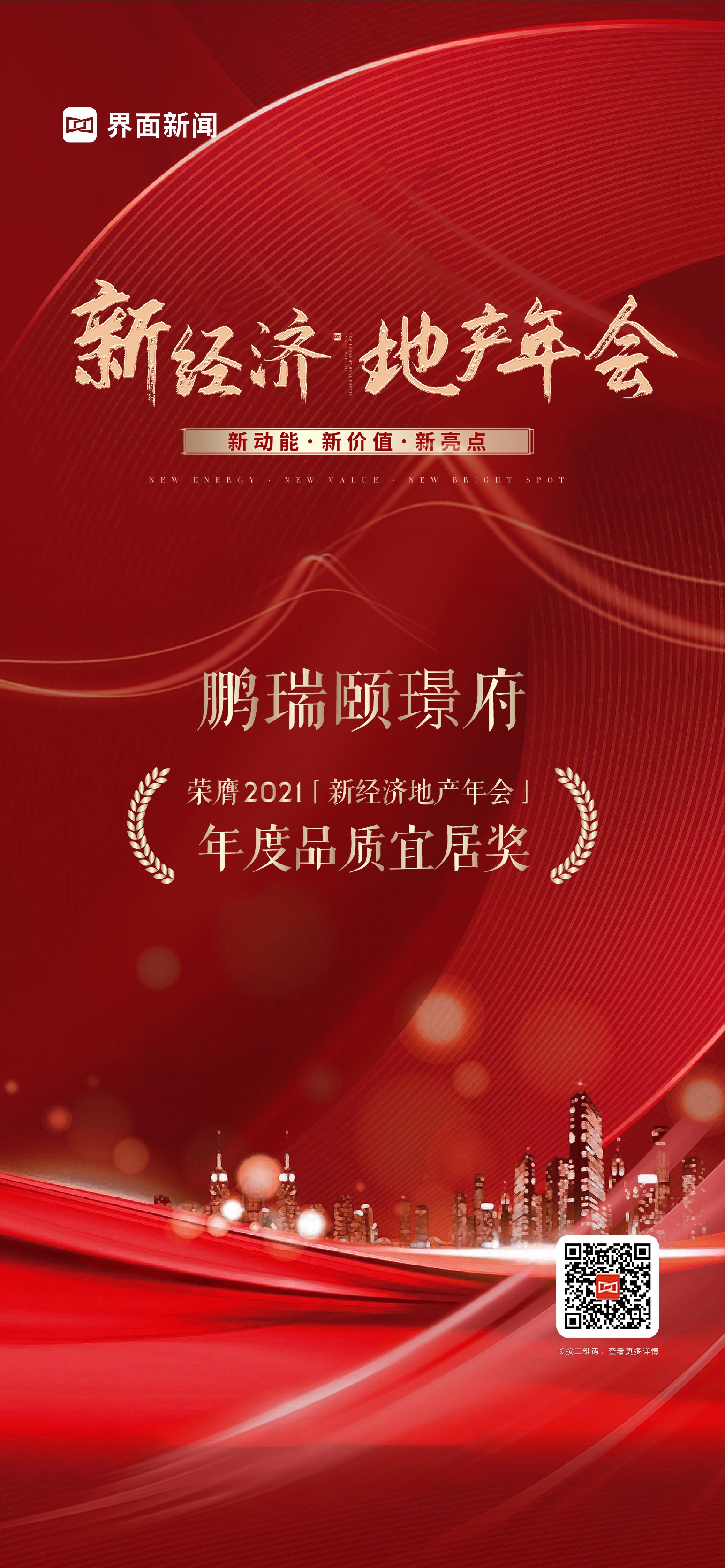 2021【新经济地产年会】推出《新经济动能榜单·城市更新地产项目榜》,围绕空间设计、产品质感、创新思想、环境配套、城市更新等维度,探索创新美好生活方式,聚焦增长新动能,甄选年度优秀地产项目。经过严格评选维度比对,通过数据筛选、大众投票、评委审议等多个环节把控,鹏瑞颐璟府凭借“六大璟系美好体系”,荣膺【2021年度品质宜居奖】。