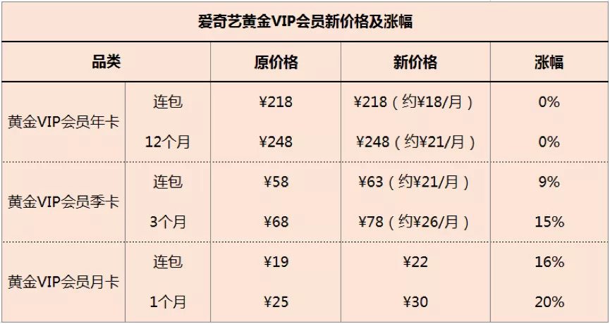 涨价的范围涉及黄金会员月卡和季卡的单独购买和连续包月,幅度在9%-20%之间,年费会员价格则保持不变,连续包年价格依旧折合18元/月。对于16日价格调整前已经购买连续包月/季/年的用户,爱奇艺还会提供为期一年的原价,在这期间这部分用户的自动续费依旧维持调整前的价格。
