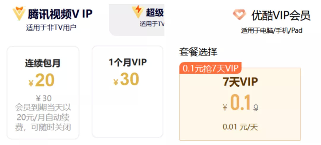 腾讯视频VIP会员选择连续包月价格更优惠(左)优酷VIP会员7天低至1分钱(右)