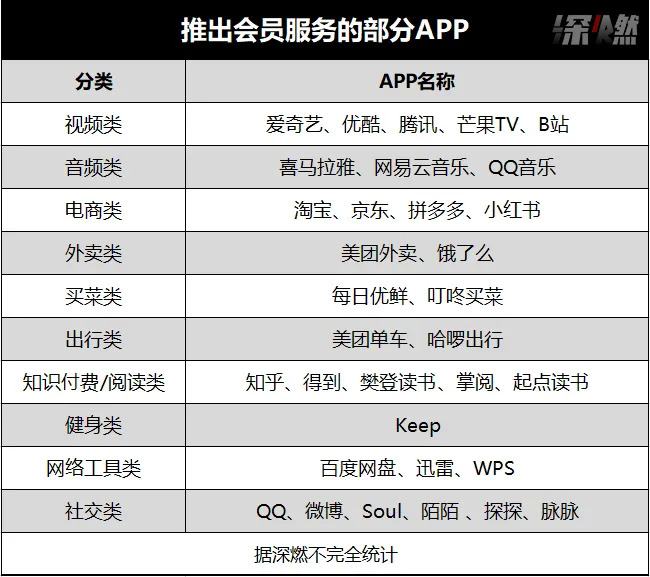 一方面,大家开通的APP会员数量不断上升。据深燃统计,目前大众在日常生活中能用到的会员,至少有33个。