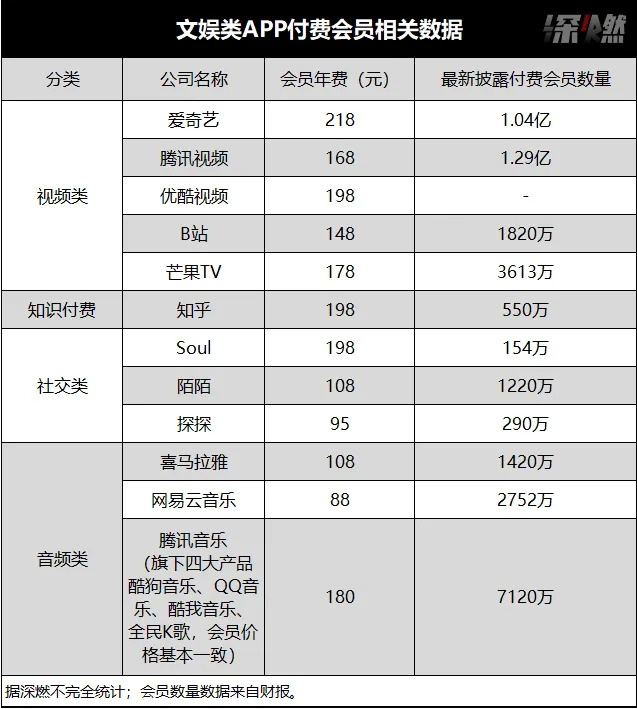 把会员收入当作重要营收来源,以长视频类APP爱优腾芒为首。