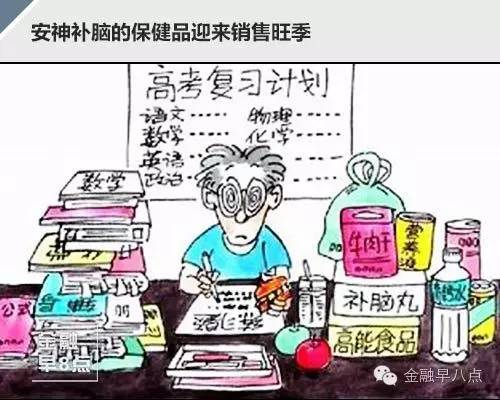 吃,很重要,考试期间的学生的营养很重要,家长极尽所能保证孩子充足的营养。城里的孩子吃点什么都比较方便,各种营养品层出,所谓安神又补脑,增强免疫力的口服液,小小一瓶要价几十。有的家长甚至购买十几种营养品,农村的孩子就要吃亏了,他们条件艰苦,吃的不多,吃块是红烧肉已经是过年的待遇了,一份营养品也许是整个家庭一年的收入。